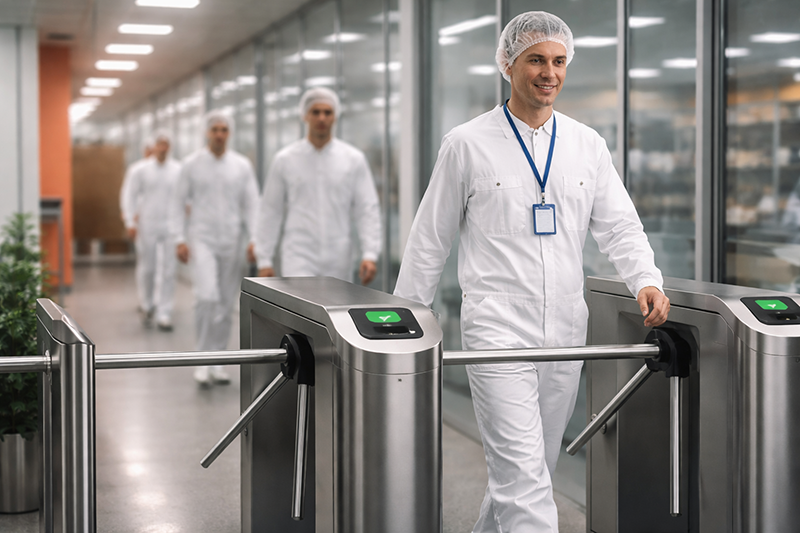 Different turnstiles control different zones. In food production, restrict high-care areas to staff with hygiene training credentials. In manufacturing, limit machine halls to qualified operators. The credential isn't just "allowed on site"—it specifies exactly which areas that person can enter.